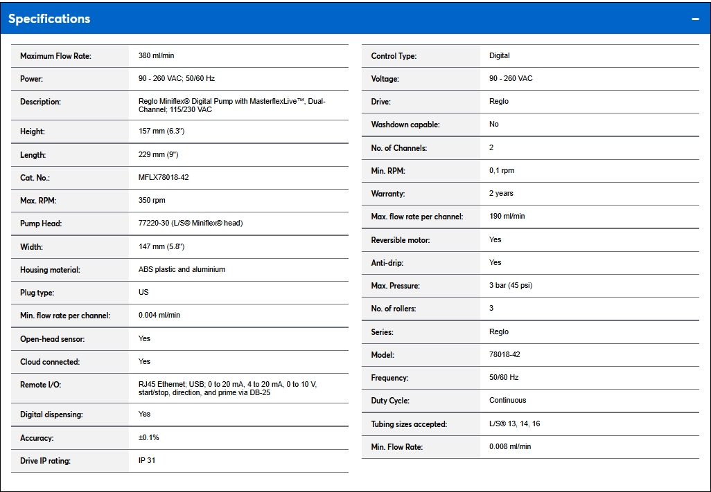Reglo Miniflex® Digital Pump with MasterflexLive™, Dual-Channel; 115/230 VAC, US, 380 ml/min, 157 mm (6.3"), 229 mm (9"), 147 mm (5.8"), 77220-30 (L/S® Miniflex® head), 90 - 260 VAC; 50/60 Hz, 350 rpm, ABS plastic and aluminium