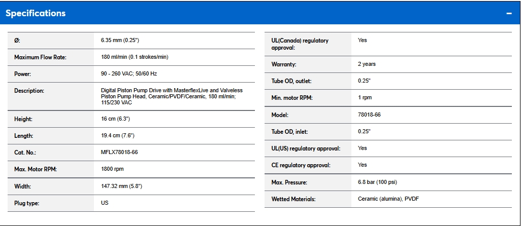 Digital Piston Pump Drive with MasterflexLive and Valveless Piston Pump Head, Ceramic/PVDF/Ceramic, 180 ml/min; 115/230 VAC, US, 180 ml/min (0.1 strokes/min), 1800 rpm, 90 - 260 VAC; 50/60 Hz, 147.32 mm (5.8"), 19.4 cm (7.6"), 16 cm (6.3"), 6.35 mm (0.25")