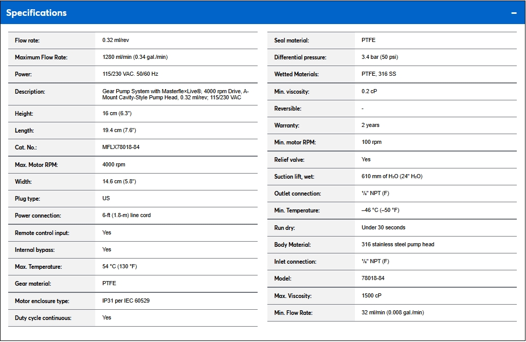 Gear Pump System with Masterfle×Live®, 4000 rpm Drive, A-Mount Cavity-Style Pump Head, 0.32 ml/rev; 115/230 VAC, US, 0.32 ml/rev, 1280 ml/min (0.34 gal./min), 4000 rpm, 115/230 VAC. 50/60 Hz, 14.6 cm (5.8"), 19.4 cm (7.6"), 16 cm (6.3")Achieve high pressure and accurate, pulseless flow - with a secure, cloud-enabled platform for monitoring.